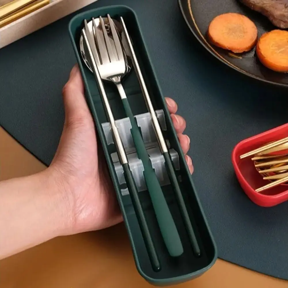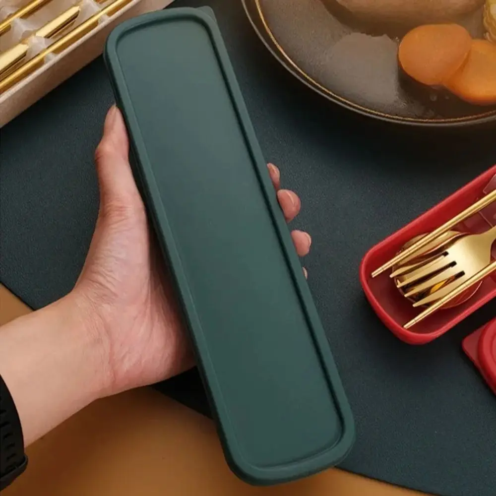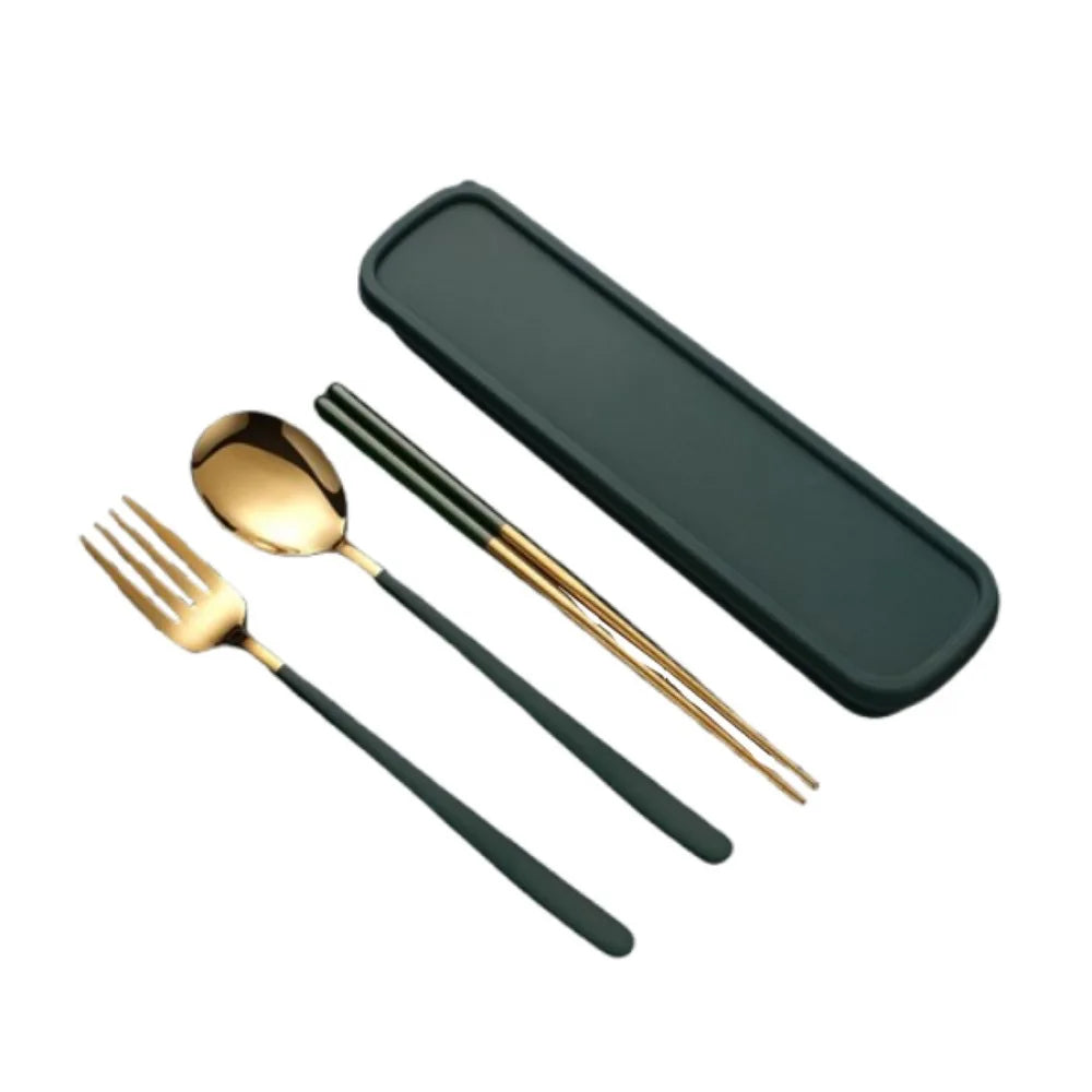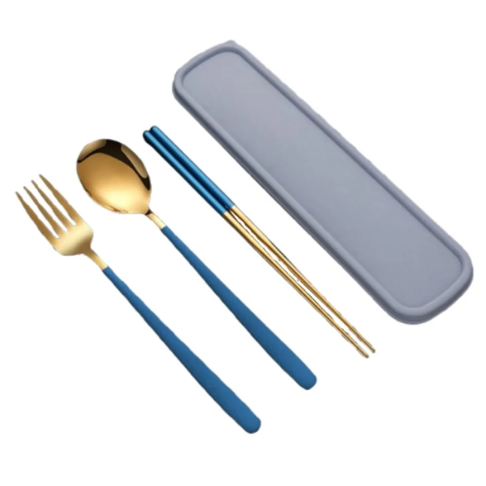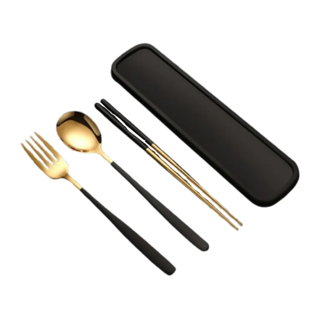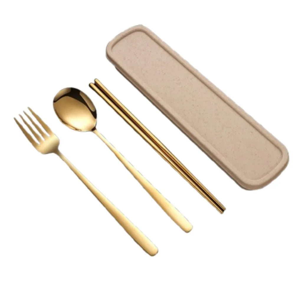 Material:Stainless Steel Color:Gold,Silver Size:As Shown Special Feature:Durable,Portable,BPA free,Non-slip Grip,Easy to Hold Package Includes:1pcs Spoon,1pcs Fork,1pair Chopsticks,1pcs Packing Box