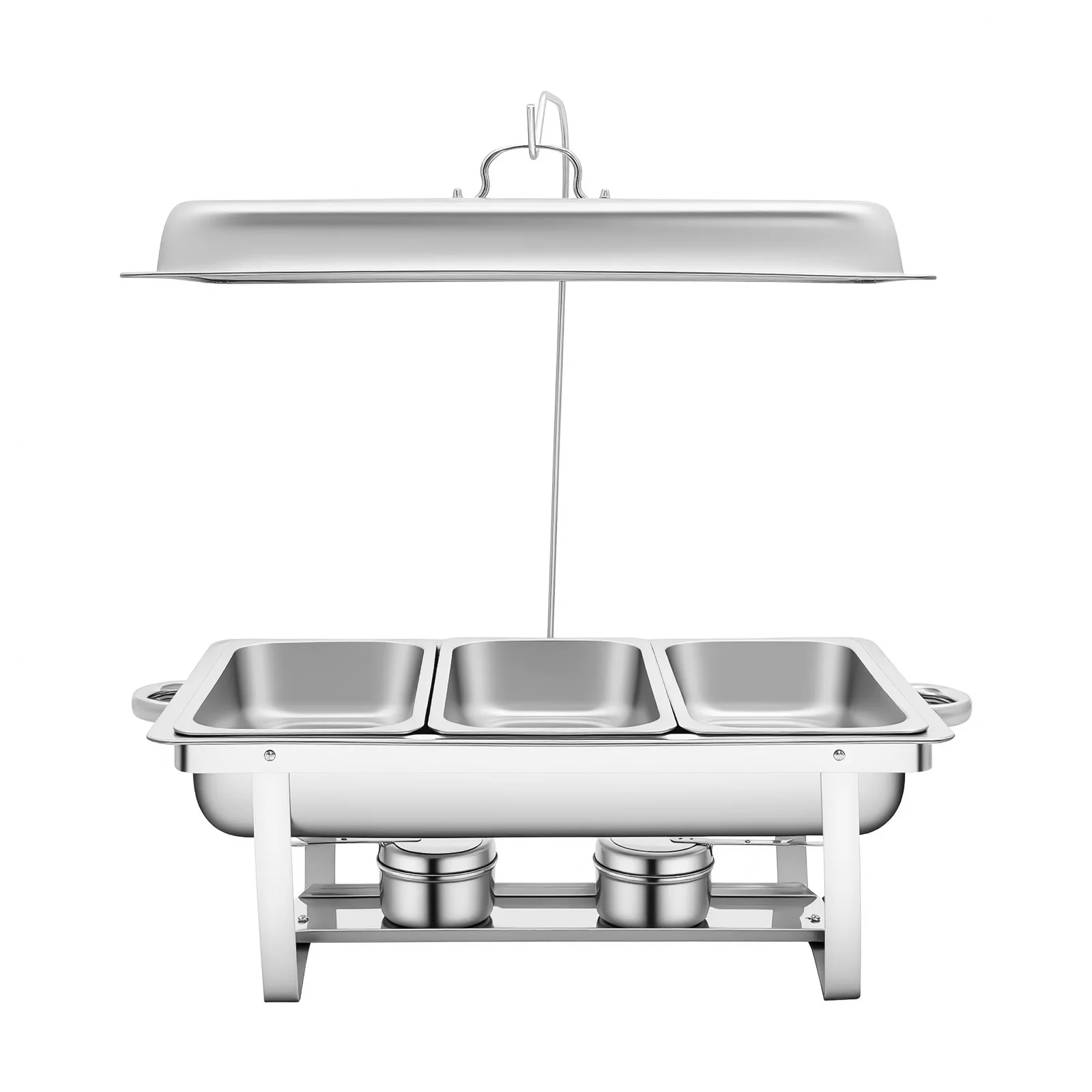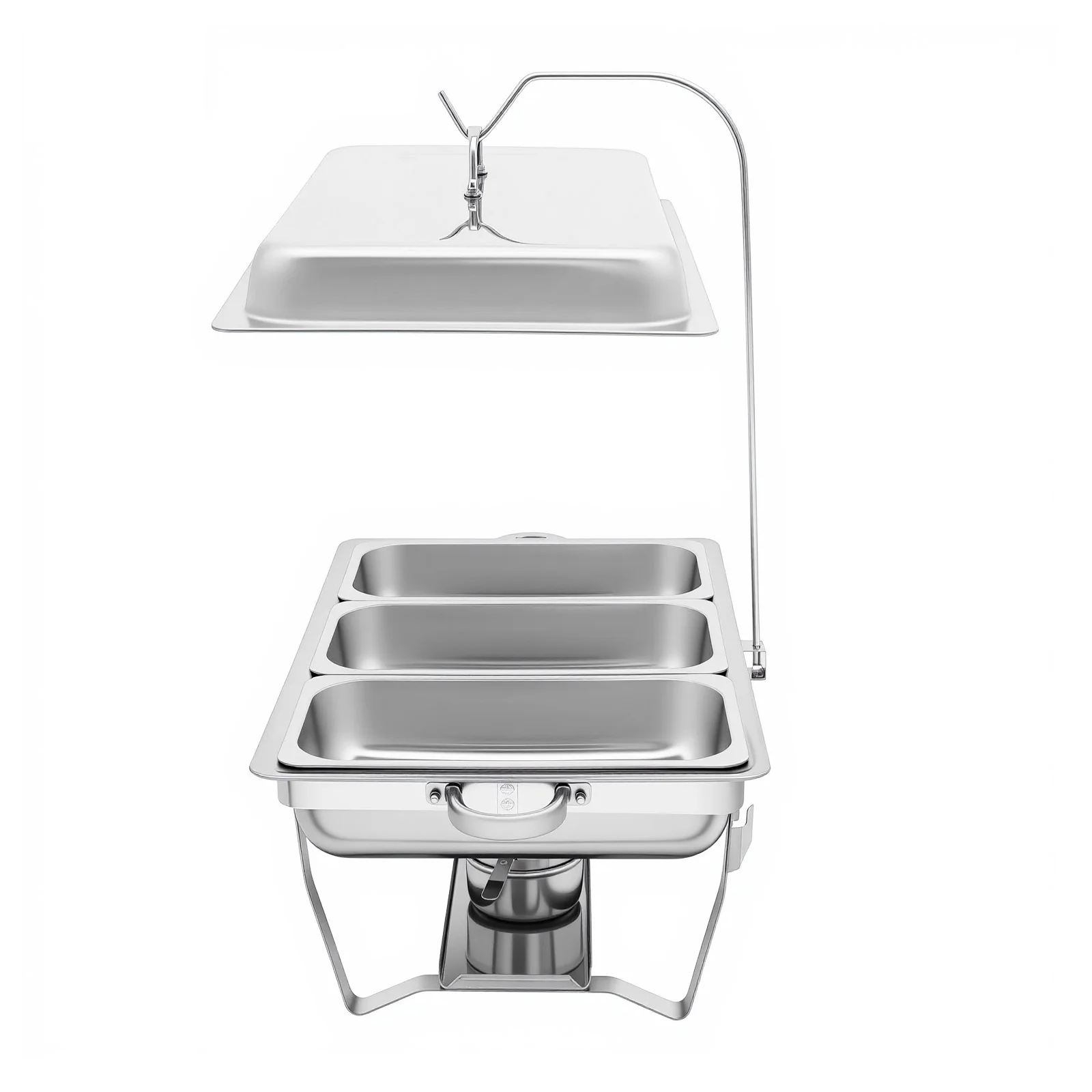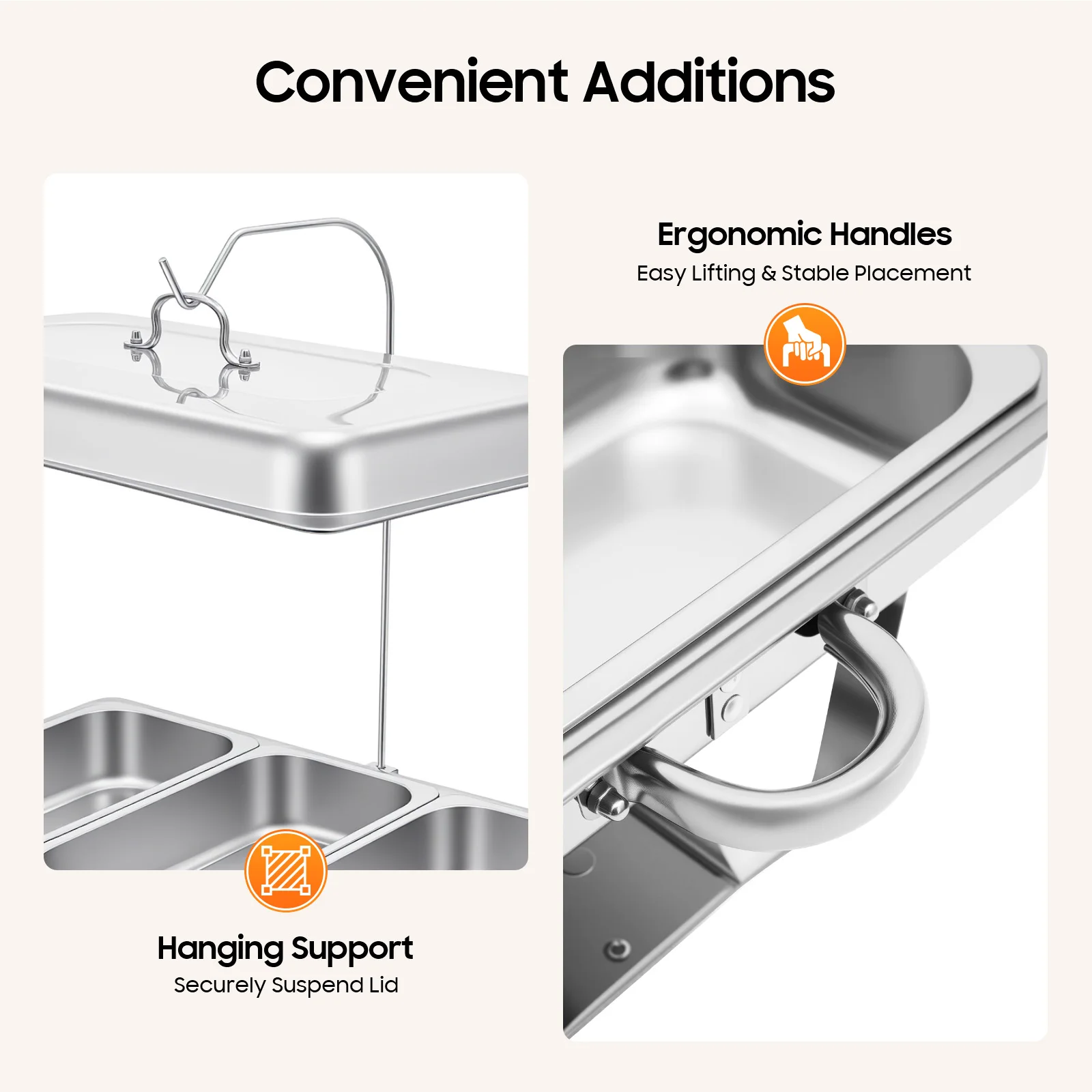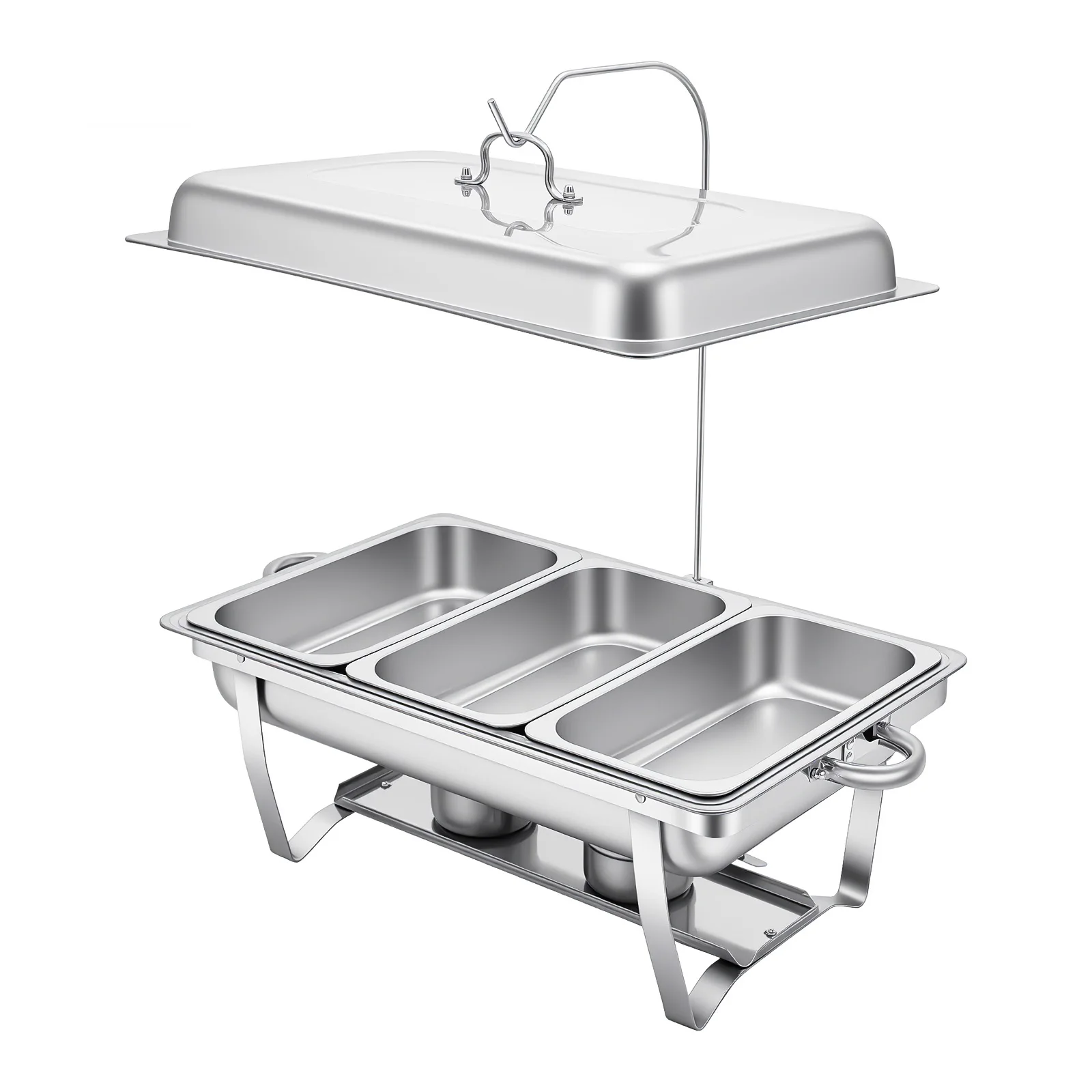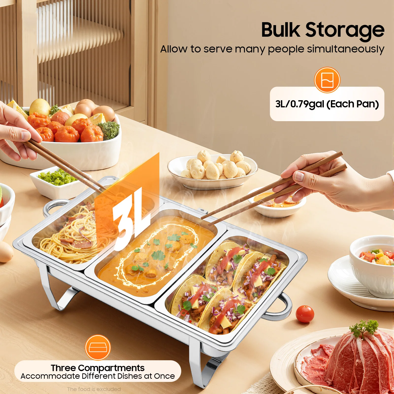 Bulk Storage: The set comes with 3 food pans, each holding 0.79 gallons. This makes it an ideal food server for hotels, cafeterias, and other activities, allowing you to serve many customers or family members simultaneously.