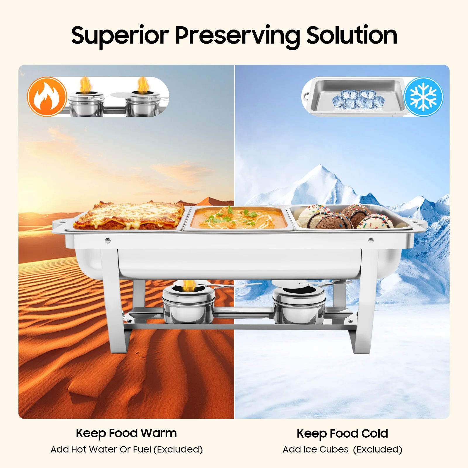 Superior Preserving Solution: Unlike bulky, noisy warming appliances, this product includes a fuel holder that delivers steady, quiet heat, keeping food warm for extended periods. What’s more, you can add ice cubes or ice water to keep fruits, salads, seafood, and more (excluded) fresh.