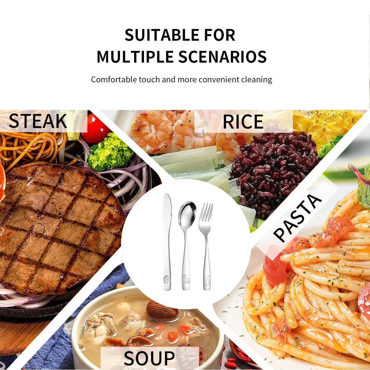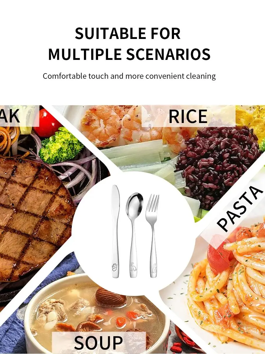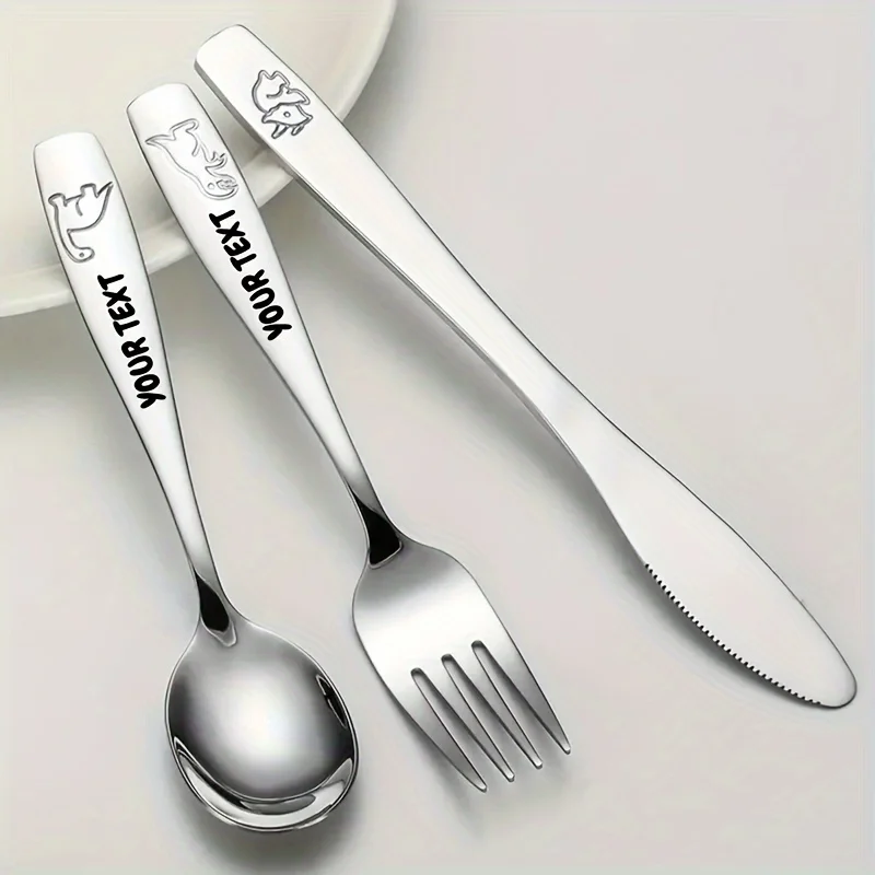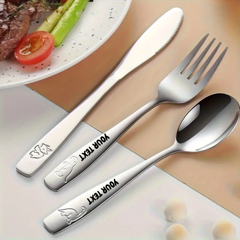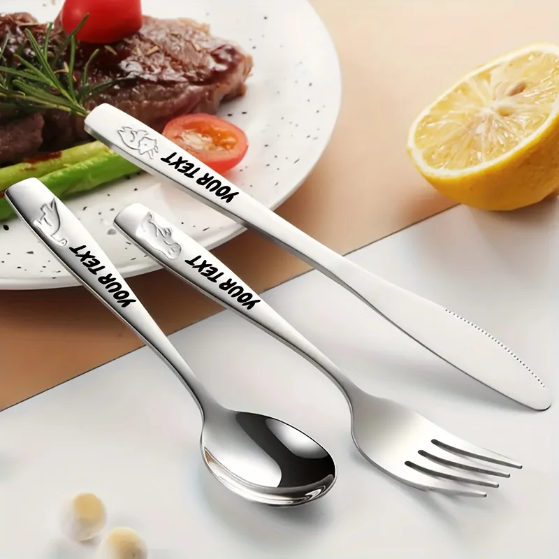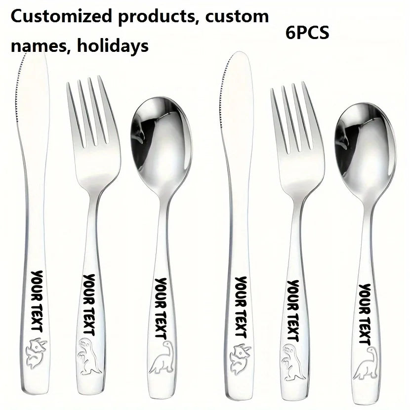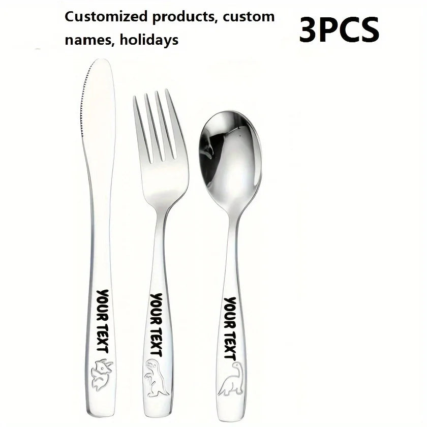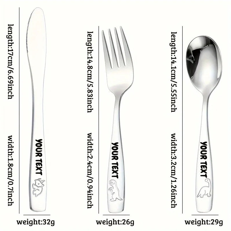 Personalized Text 304 Stainless Steel Tableware Set, Engraved Name Children's Knives Forks Spoons with Cute Featuring Dinosaur